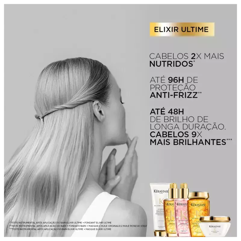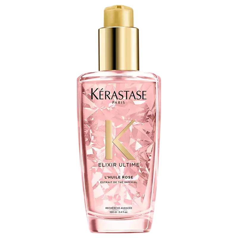 Óleo nutritivo para cabelos sem brilho. Kérastase Elixir Ultime L’Huile Rose repõe os nutrientes necessários para conferir brilho e suavidade aos fios.