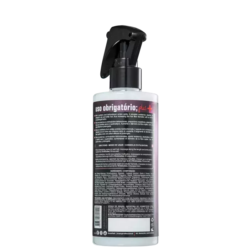 O Reconstrutor Capilar Truss Uso Obrigatório Plus+ conta com uma inovadora tecnologia antiquebra, recupera, reestrutura e repara totalmente as áreas da fibra capilar que estão fragilizadas. Os ativos agem diretamente no danos dos fios e devolvem nutrição, vitalidade, brilho e elasticidade.